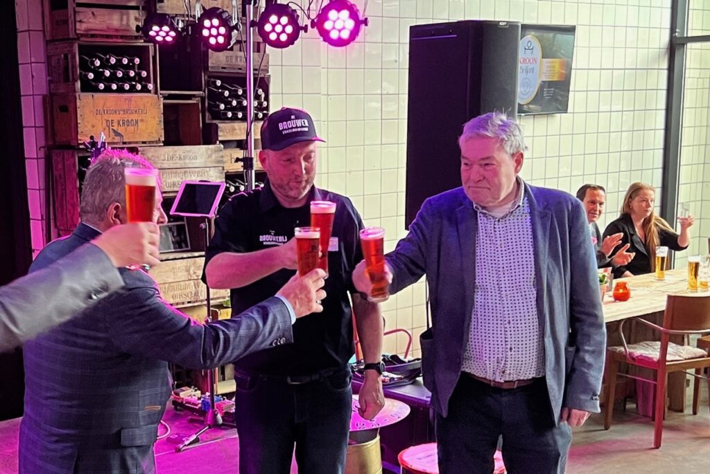 Op de foto brouwer proost brouwer Frans Schamp (midden) met neven Thieu (achter het bierglas) en Gerard de Kroon bij de presentatie van het jubileumboek 400 jaar brouwen aan de Koestraat