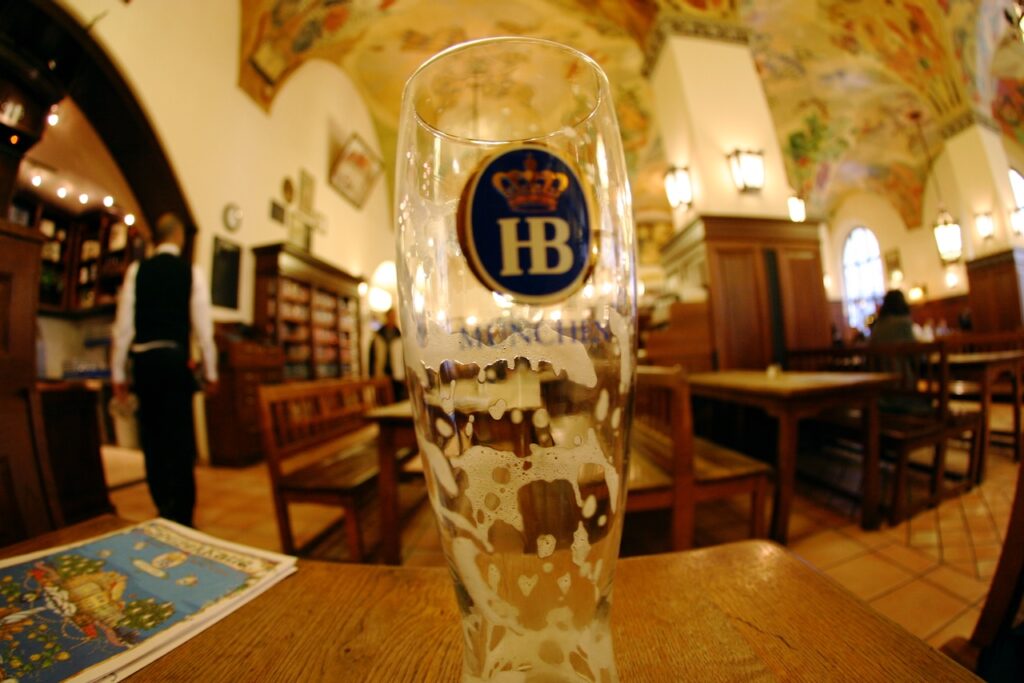 De grote zaal van het Hofbräuhaus kan zo’n dertienhonderd gasten bergen die zich het bier goed laten smaken. Het Hofbräuhaus noemt zich einer Berühmtesten Wirthausen der Welt en dat is terecht. In vrijwel iedere reisgids komt de uitspanning voor. Bij binnenkomst is de enorme hal met vrolijk geschilderde gewelven indrukwekkend. Overal lange houten tafels, overal mensen. Als je in de rest van het jaar iets van de sfeer van het Oktoberfest wilt proeven, is dit de plek. In het midden van de prachtige hal zit een blazersensemble plichtmatig een deuntje weg te toeteren. Vrouwen met pofmouwen lopen met pullen bier rond. Het meisje met de mooiste blosjes op haar wangen loopt met een penswinkeltje rond en verkoopt Bretzels, een soort grote broodkrakelingen. Haar haar springt onder de blauwwitte hoofddoek weg. Aan lange tafels zitten studenten, verzonken achter een zwembad bier, maar vooral uitgelaten toeristen. Voor hen speelt de hoempa nog een deuntje. Eentje maar, daarna is het weer vijf minuten rust. Er zijn nu eenmaal ook mensen die rustig een krantje willen kunnen lezen. Stamgasten kunnen hun bierpul in een speciaal kastje opbergen, zodat hun eigen pul altijd voor ze klaar staat. Op de eerste verdieping is een speciale feestzaal waar nog eens duizend gasten aan tafel kunnen.