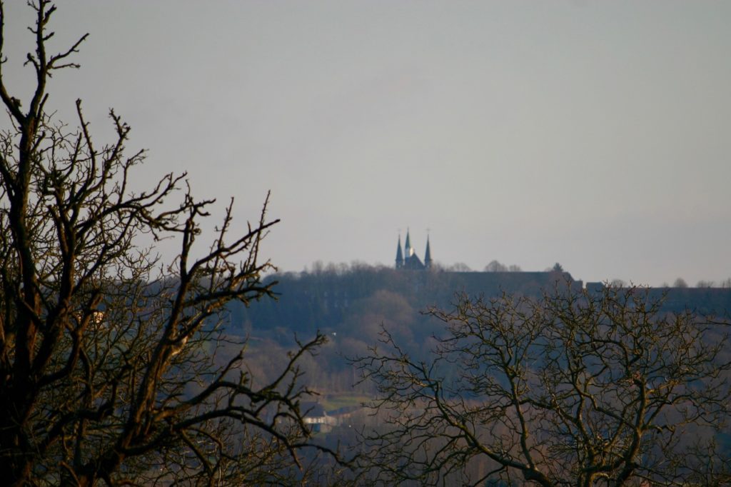 [2012] Ik heb een zwak voor de abdij op de Katsberg. Dat komt alleen al door de locatie. Het klooster ligt op een hoge heuvel in het vlakke Vlaamse land in het uiterste noordwesten van Frankrijk. De ligging is aan de ene kant majestueus en onneembaar als een Middeleeuws kasteel. Aan de andere kant liggen de gebouwen wat verscholen in de bossages zoals je van een klooster verwacht. De onwerkelijke combinatie van Franse zwier en Vlaamse plaatsnamen van deze streek, brengt mij in een sprookjesachtige sferen, alsof ik Alice in Wonderland zelf beleef. Plaatsjes als Hondschoote of Godewaersvelde kennen geen bakker met krentebollen of slager met gehaktballen, maar een boulanger met knapperige flutes en charcuterie met pittige worstjes. De Katsberg zelf heeft zijn naam verfranst tot Mont des Cats.