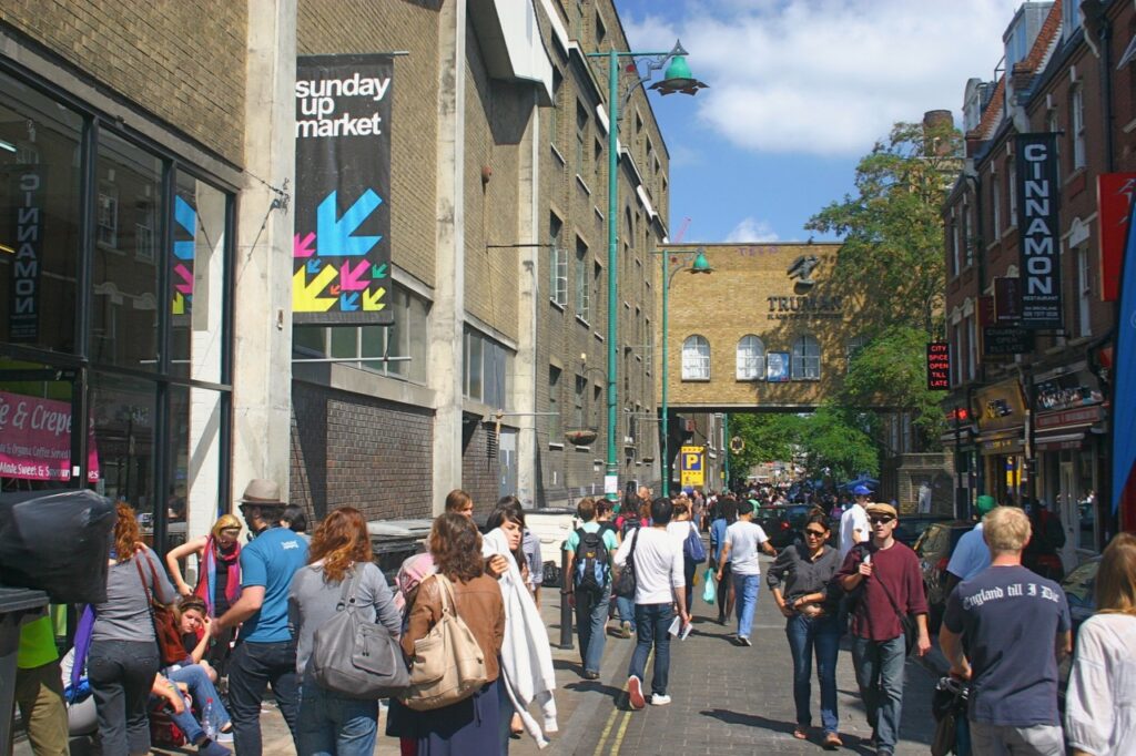 Het centrale punt van deze Sunday Up Market is de Old Truman Brewery. Zoals de naam al doet vermoeden, zijn dit de gebouwen van een voormalige brouwerij. De Truman brewery gaat terug tot 1666 toen Joseph Truman in Brick Lane met brouwen begon. Het bedrijf groeide uit tot de grootste brouwerij van Londen en de op een na grootste brouwerij van het land. De brouwerij werd bekend om zijn porter, een donker bier dat in de achttiende eeuw vooral onder havenwerkers (‘porters’) populair was. De locatie aan Brick Lane, in de loop der eeuwen vele malen verbouwd en uitgebreid, bleef tot 1989 in gebruik. In dat jaar werd productie gestaakt en raakten de brouwerij gebouwen langzaam in verval. Nu is Old Truman Brewery een verzamelplaats van creatieve bedrijfjes, kleine winkeltjes en verrassende restaurants. Op zondag komt het complex helemaal tot leven. De rode dubbeldekker is blijkt een bar te zijn met een groot terras. Het ketelhuis is foodplaza en de magazijnen zijn verbouwd tot markthal.