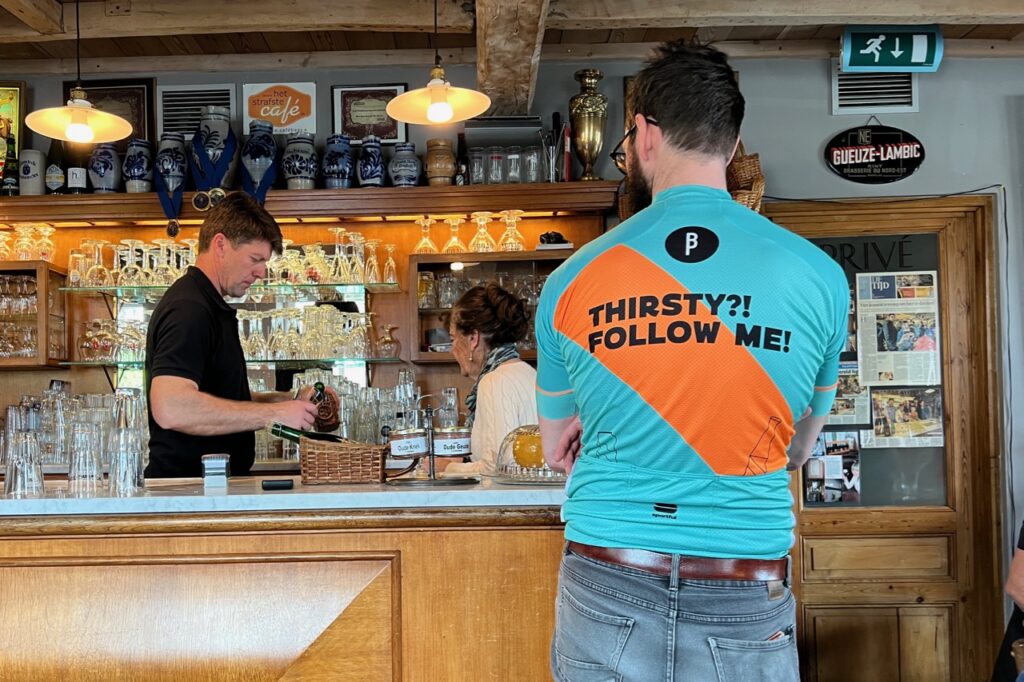 Om ons heen vullen te tafels zich met wielrennende bierliefhebbers, en als de kerk uit gaat ook met enkele gasten uit het dorp. De uitbater legt de flessen geuze lieflijk in een mandje en ontkurkt ze met zorg. Zo kan de gist in de fles het bier niet vertroebelen. Het is een gezellig gemurmel van genietende mensen. In zijn prachtige lofdicht op dit streekbier schrijft Hubert van Herreweghen over de geuze: het is “een familiedrank, een welkomsdrank, een vriendschapsdrank. Het is geen drank voor alcoholisten. Het is tenslotte meer dan een gezonde drank. Het is een remedie”. Hij haalt ook Goethe aan: “wie een drank wil proeven en verstaan, moet in zijn land van herkomst gaan.” Dat doen we en denken na alweer een mooie fles oude geuze goed op weg te zijn.